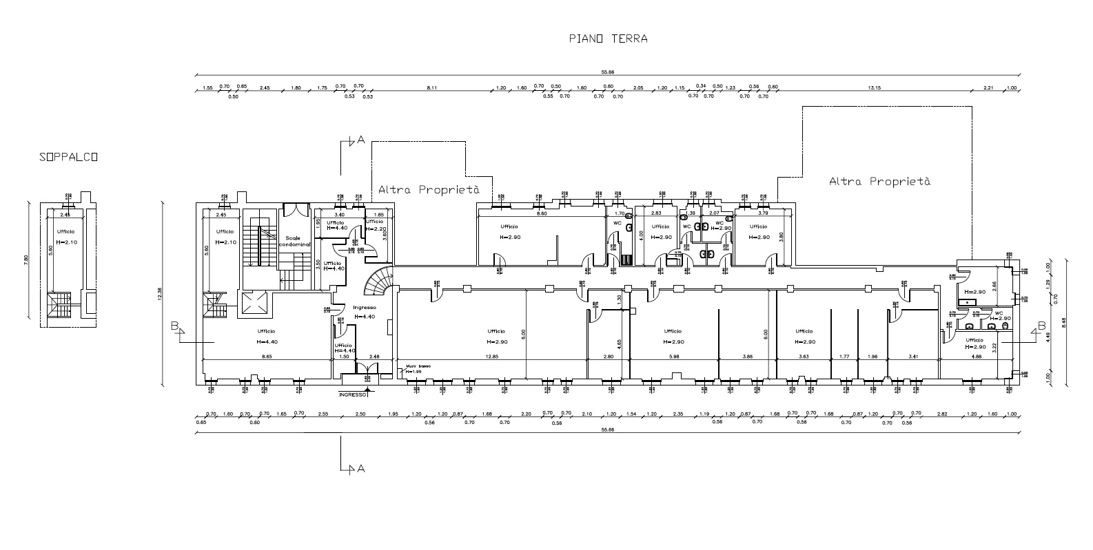 In prossimità dell’ingresso, posto a quota marciapiede, si trova un locale archivio collegato al piano rialzato tramite una scala interna.